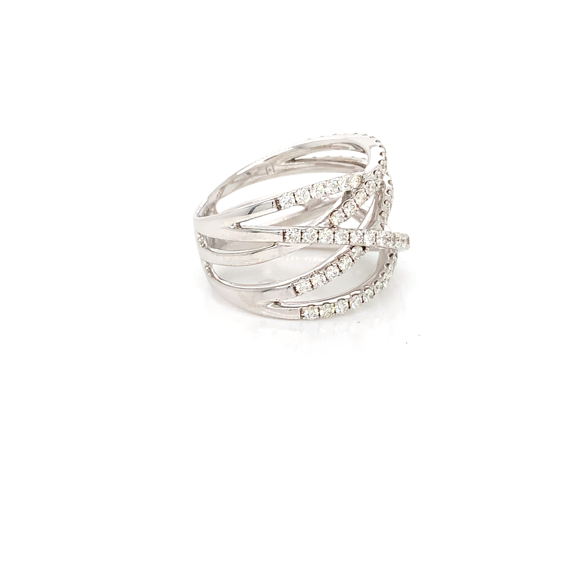 This exquisite 14kt white gold crisscrossband ring brings together modern design and timeless elegance. Forged in premium 14K white gold, its overlapping multi-band silhouette creates a fluid, criss-cross pattern that sits comfortably on the finger. Each band is meticulously pavé-set with 1.25 ct of brilliant natural diamonds, delivering an eye-catching sparkle with every movement.