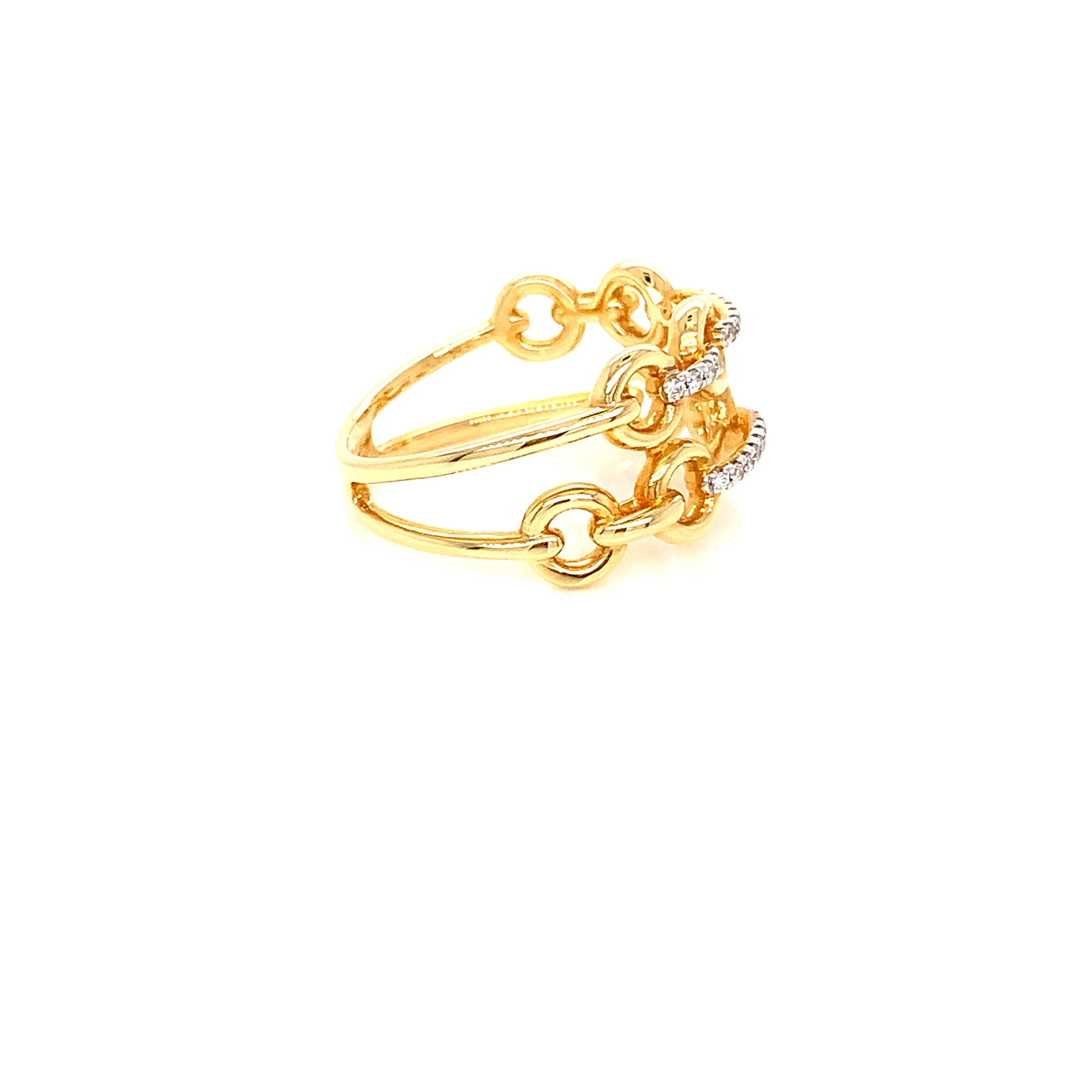 This 18kt yellow gold chain ring is a fixed double-stack chain design set with Natural Diamonds totaling 0.10 ct. Made in 18K yellow gold and shown in size 6.5, the ring presents two aligned chain rows with diamond detail across the front.