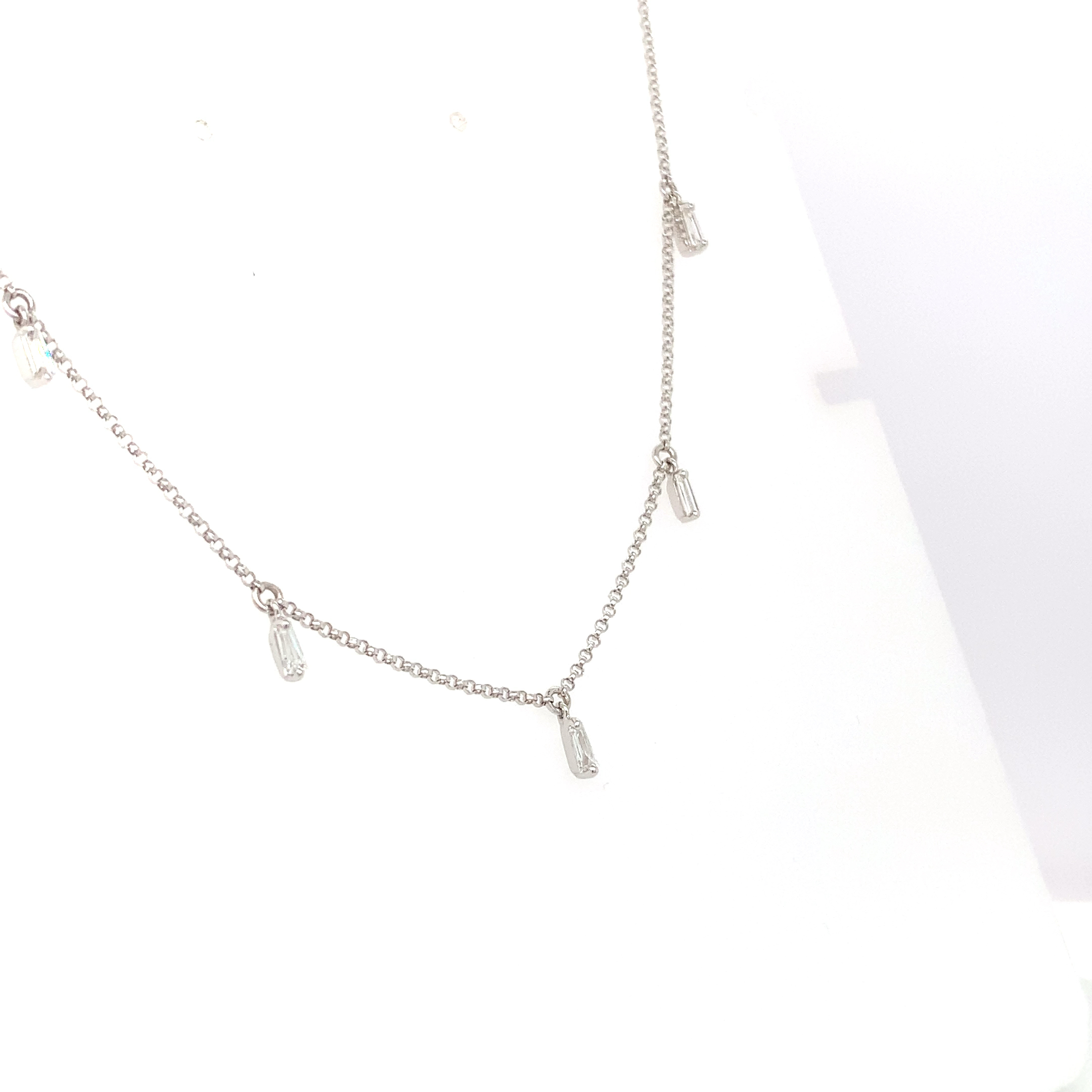 This hanging baguette necklace 18kt is an 18kt white gold necklace designed with hanging baguettes arranged along a fine chain. Total weight is 0.37ct, and the length is 18 inches. The focus is a clean white-gold finish with slim drops spaced at intervals for a light profile and simple movement.