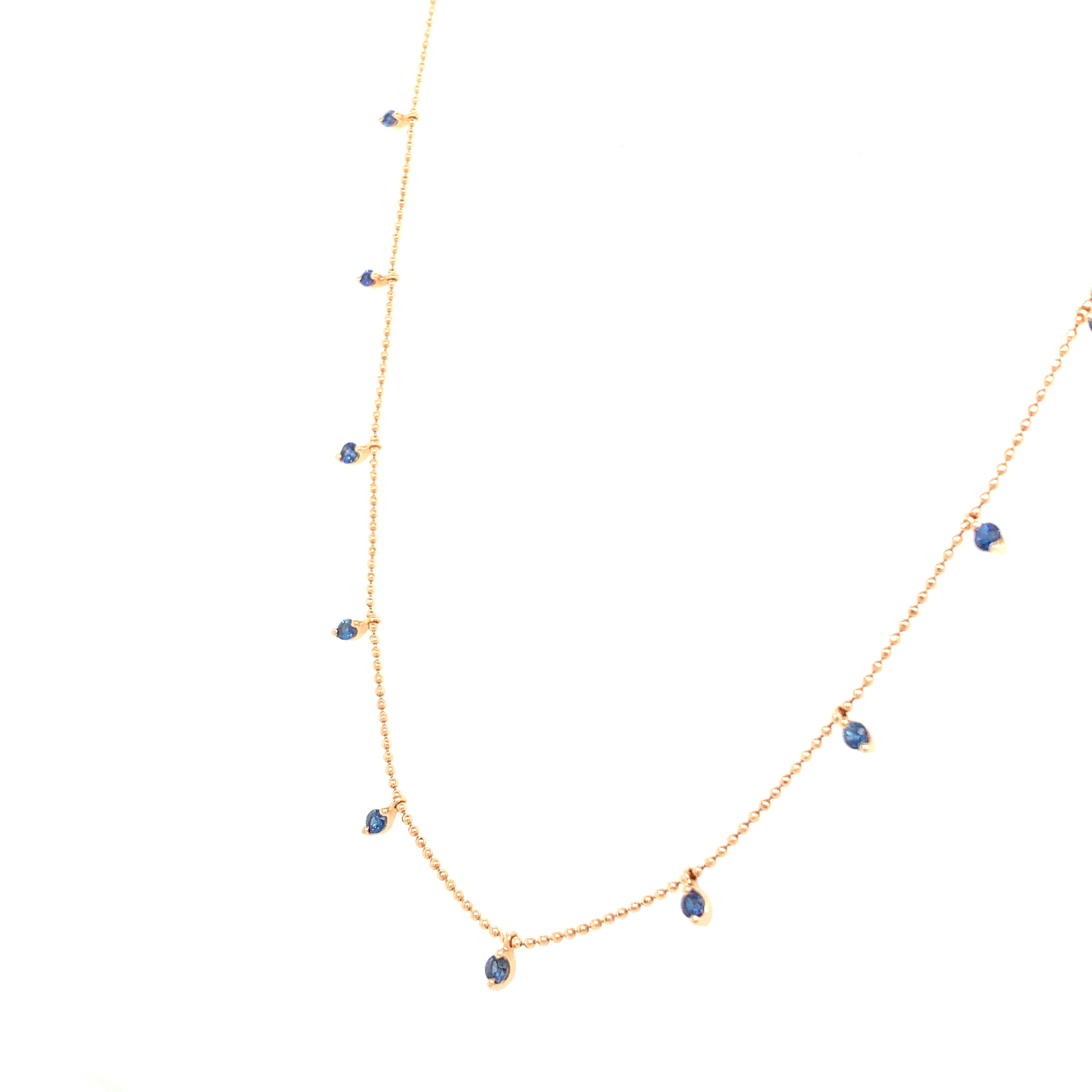 This blue sapphire bead necklace is crafted in 18kt Rose Gold with evenly spaced blue sapphires totaling 0.55ct. The fine bead chain keeps a light profile, while the sapphires are set at intervals to show color along the neckline. The length is 18 inches, designed to sit naturally at the collarbone without additional motifs or attachments. The emphasis is on bead-chain texture, the rose-gold tone, and the clean placement of the sapphires.