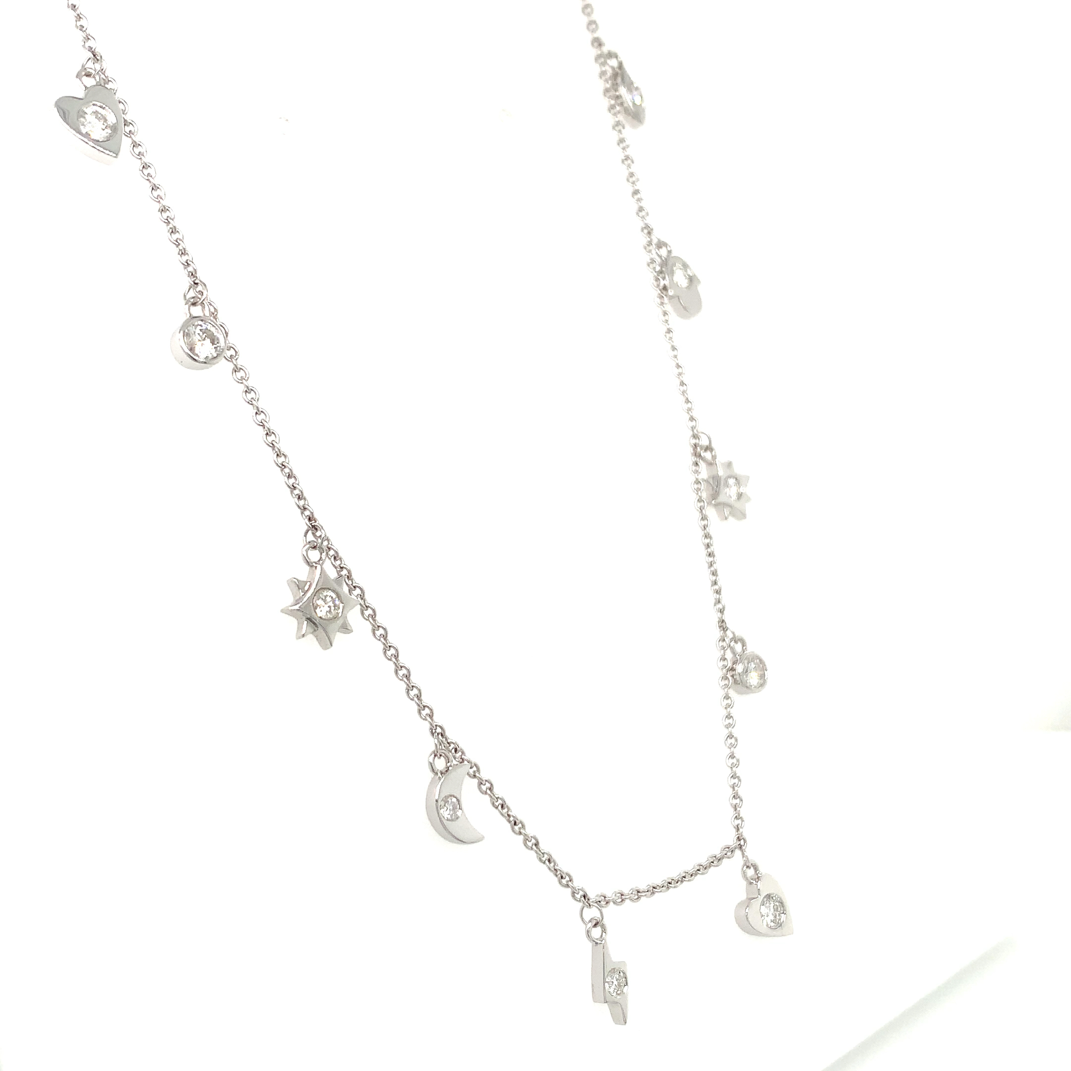 This diamond charm necklace wg 18kt is an 18kt White gold necklace with assorted charms, each set with a diamond. Total diamond weight is 0.70ct. The chain length is 18 inches. The layout focuses on a white-gold chain with evenly spaced charms, each carrying a single diamond for defined points of sparkle. The piece is presented as described, without additional motifs beyond the assorted charms and their single-diamond settings.