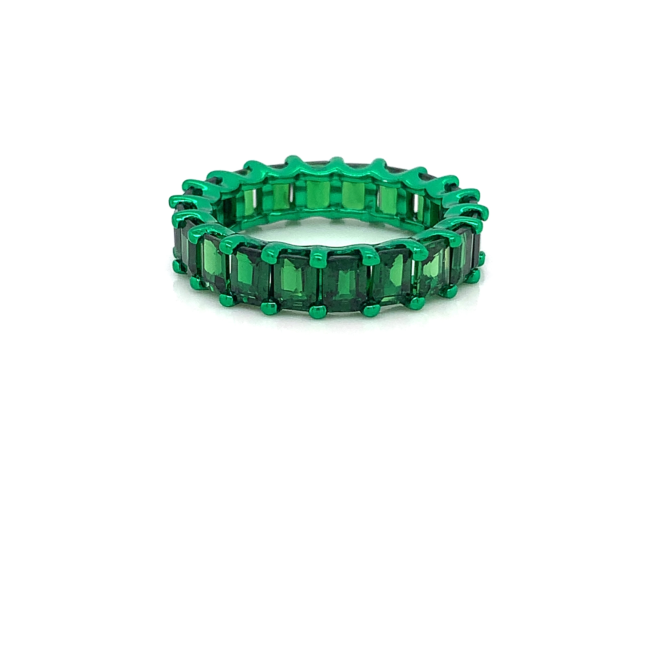 This green garnet eternity band is 18kt white gold with green rhodium, set with emerald cut green garnets totaling 5.08ct. The style is an eternity band, presented here in size 6.5. Stones are arranged in a continuous row to show the emerald-cut shape all around, matching the metal’s green rhodium tone.