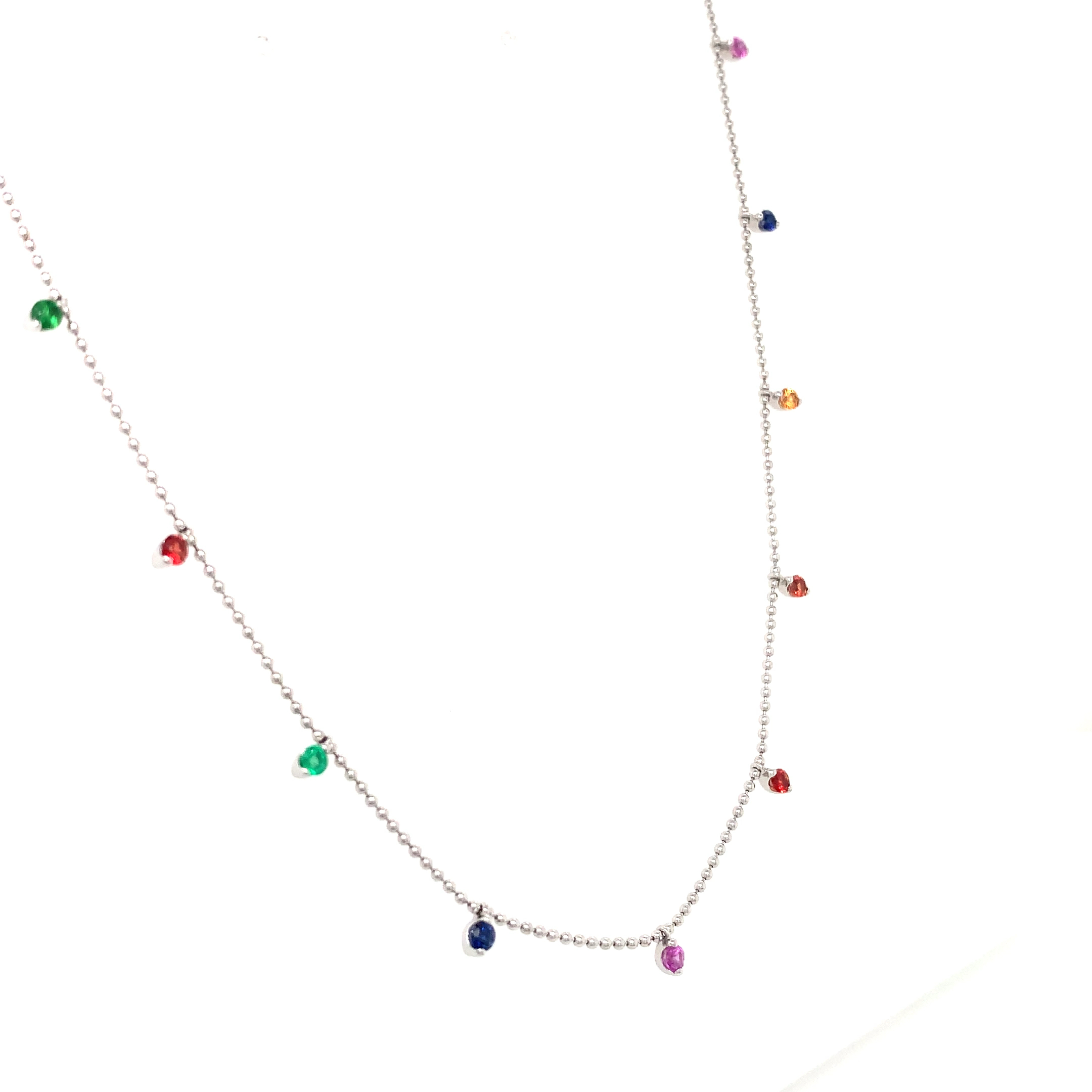 This multicolor sapphire bead necklace is an 18kt White Gold Bead Necklace set with assorted multicolor sapphires totaling 0.65ct. The bead chain places small sapphire settings at intervals to keep a light profile and consistent color. The length is 18 inches, intended to sit at the collarbone with a straightforward, minimal layout.
