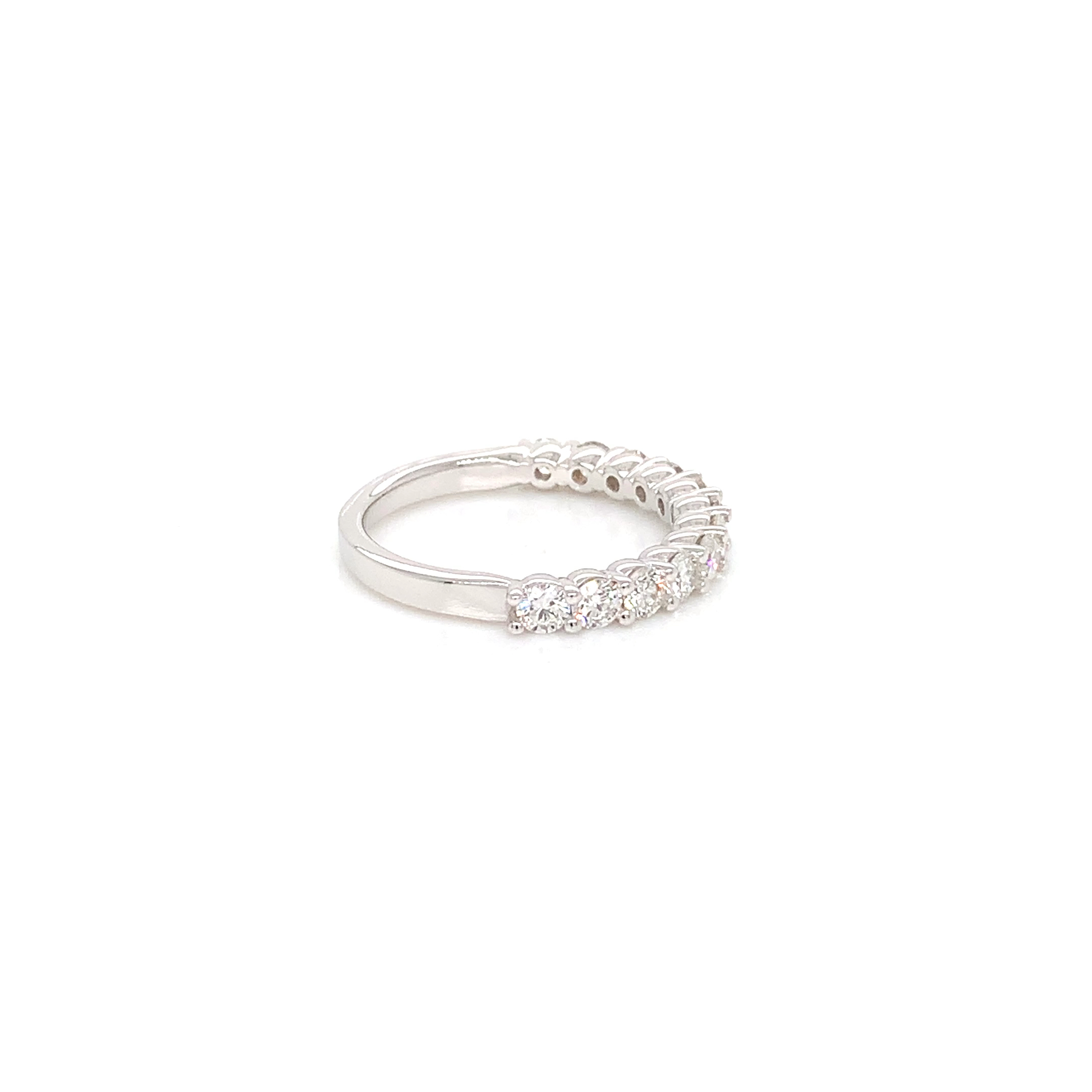 An 18kt white gold band with a continuous half-row of round brilliant cut diamonds totaling 0.84ct. The front section shows a neat, scalloped shared-prong pattern that lets each round stone sit closely in sequence for an even line of sparkle. The back transitions to a smooth, polished shank, keeping the profile low and comfortable while the bright white-gold tone emphasizes the diamonds’ clarity. Listed in size 6.25, the layout reads clean and classic with all attention on the round stones and the straight band form.